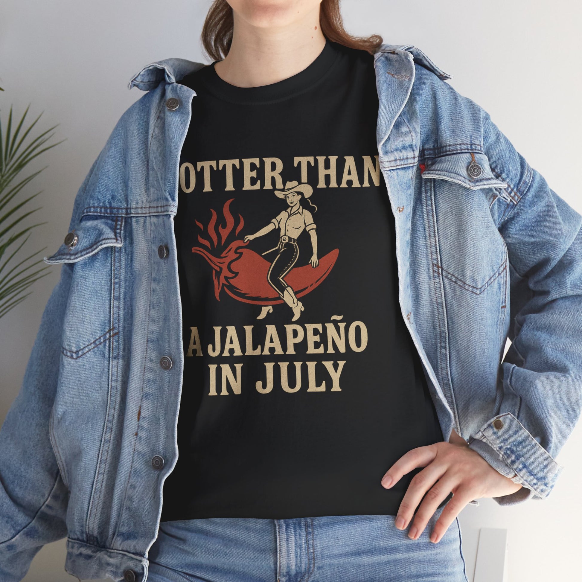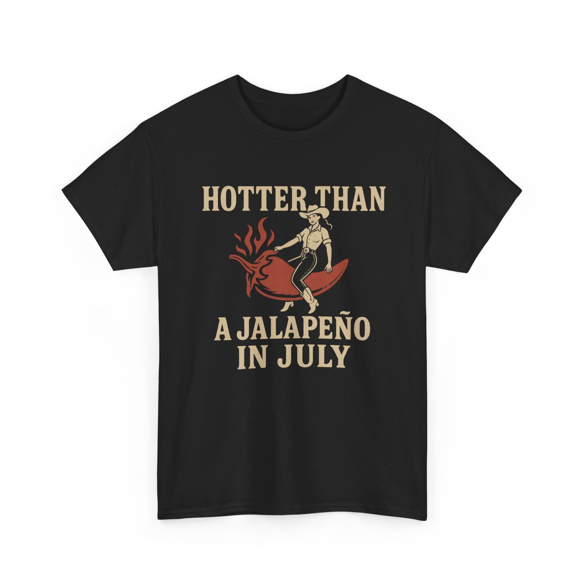 This relaxed crew-neck tee channels sun-soaked, slightly mischievous summer energy. The vintage-style graphic — a rider atop a pepper with flames and the words “Hotter Than A Jalapeño In July” — feels like a laugh shared between friends at a backyard barbecue. It sits comfortably on the body without hugging, and the soft, midweight cotton gives it that lived-in feel that gets better with each wash. Wear it on long, lazy afternoons, to a chili cook-off, or when you want to say you’re here for the heat and the humor. The neutral print palette pairs well with denim shorts, a worn-in jean jacket, or layered under an open flannel when evenings cool down.