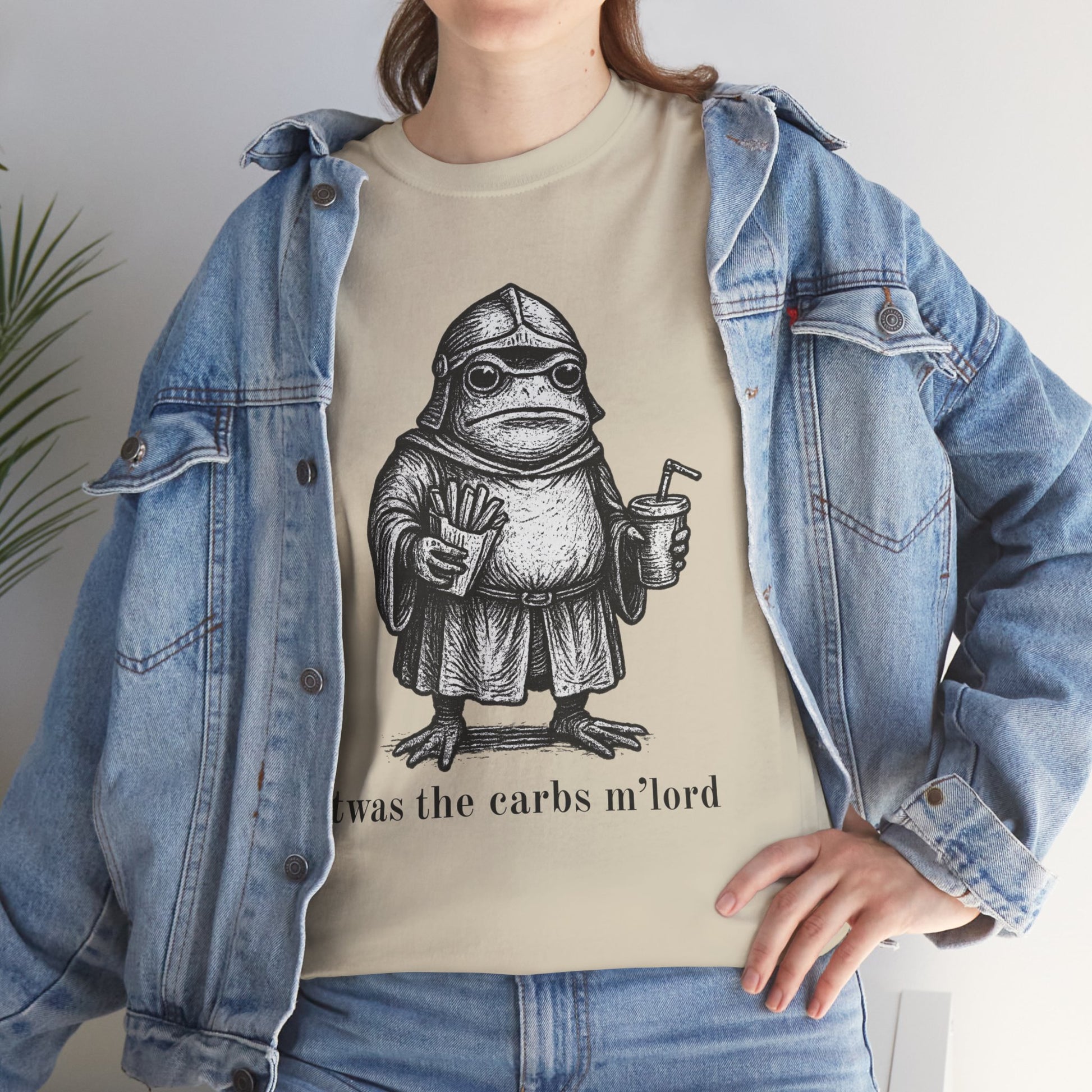T-Shirt — 'It was the carbs m'lord' Funny Frog Knight Graphic Tee